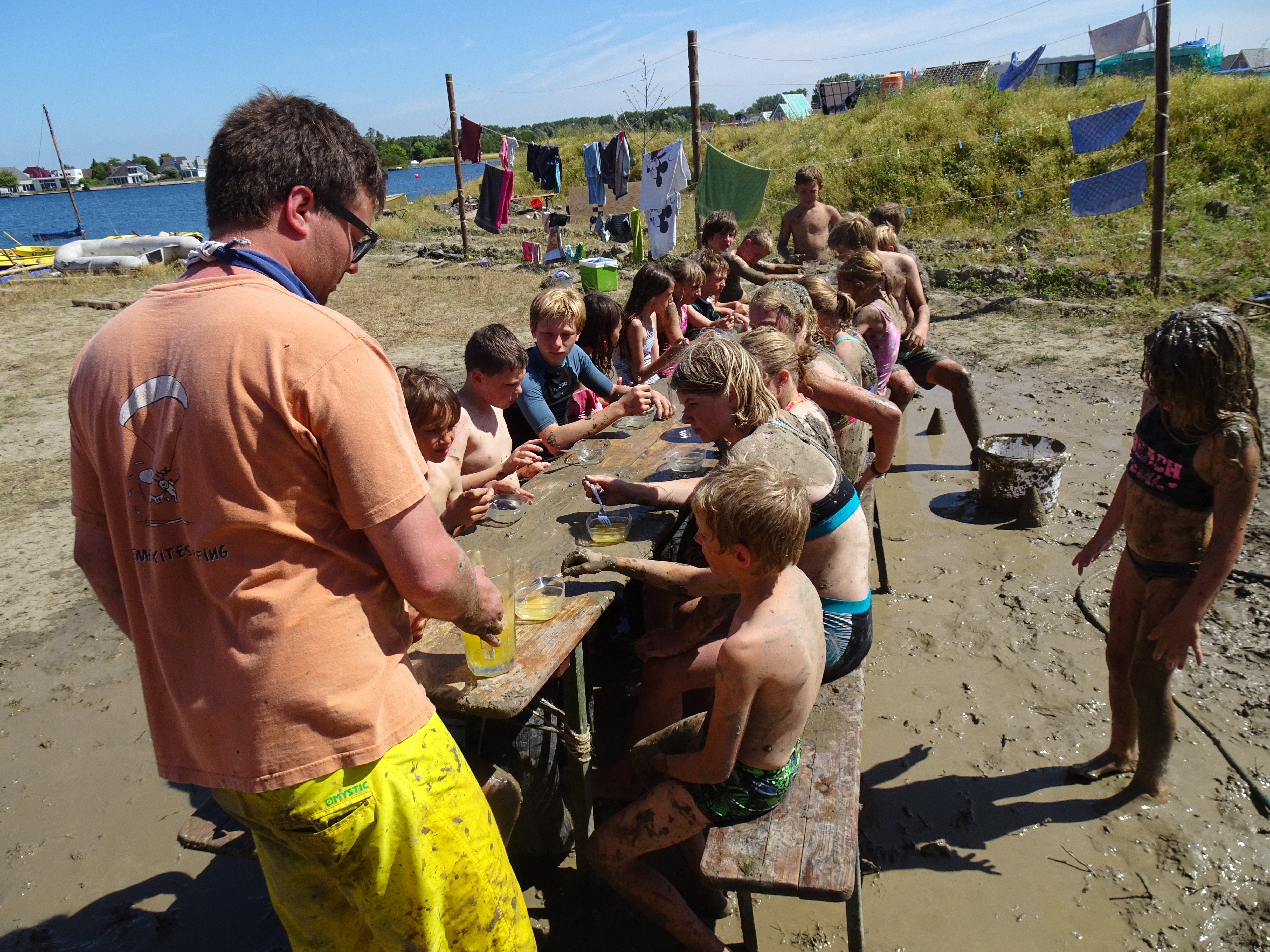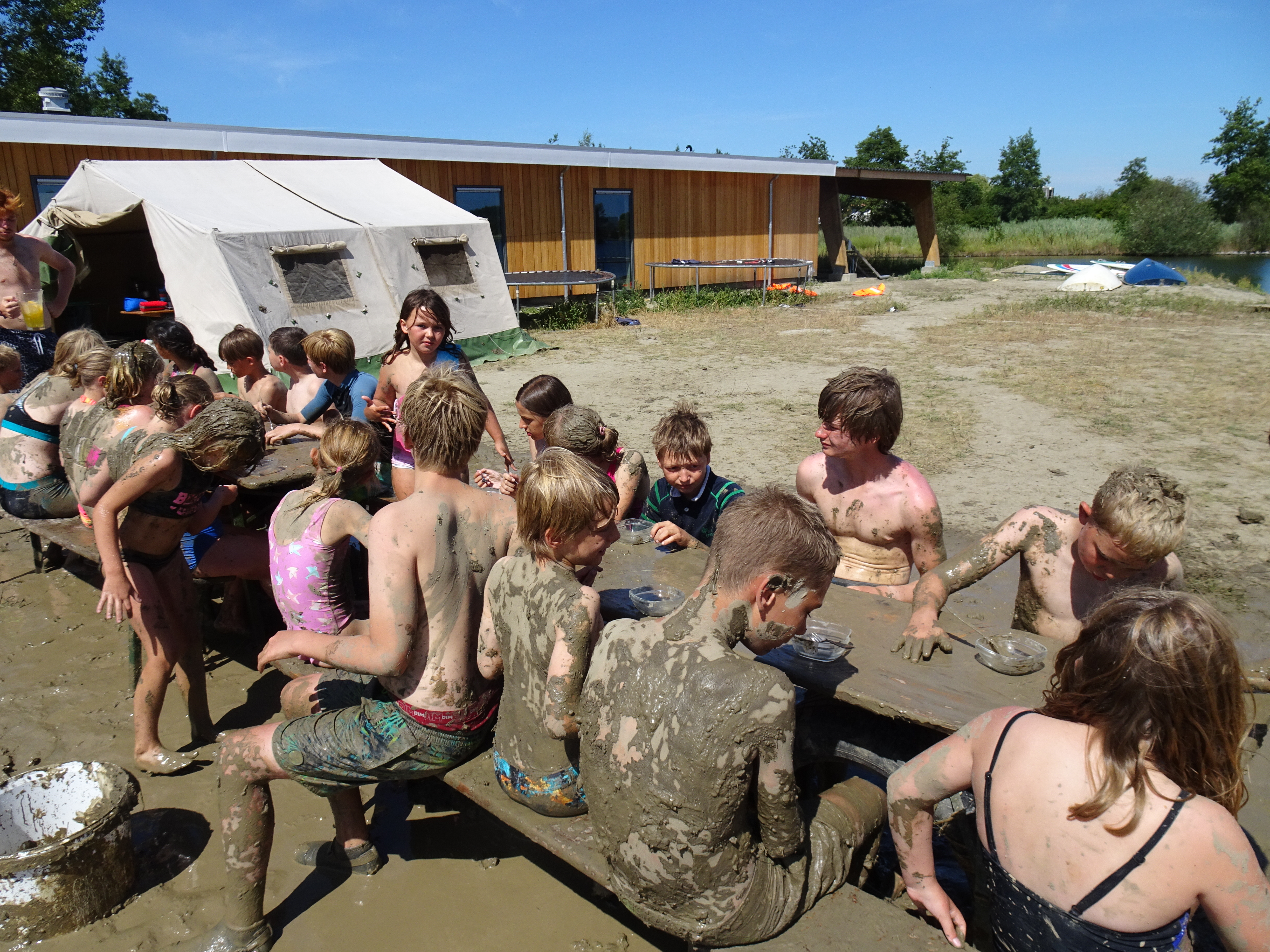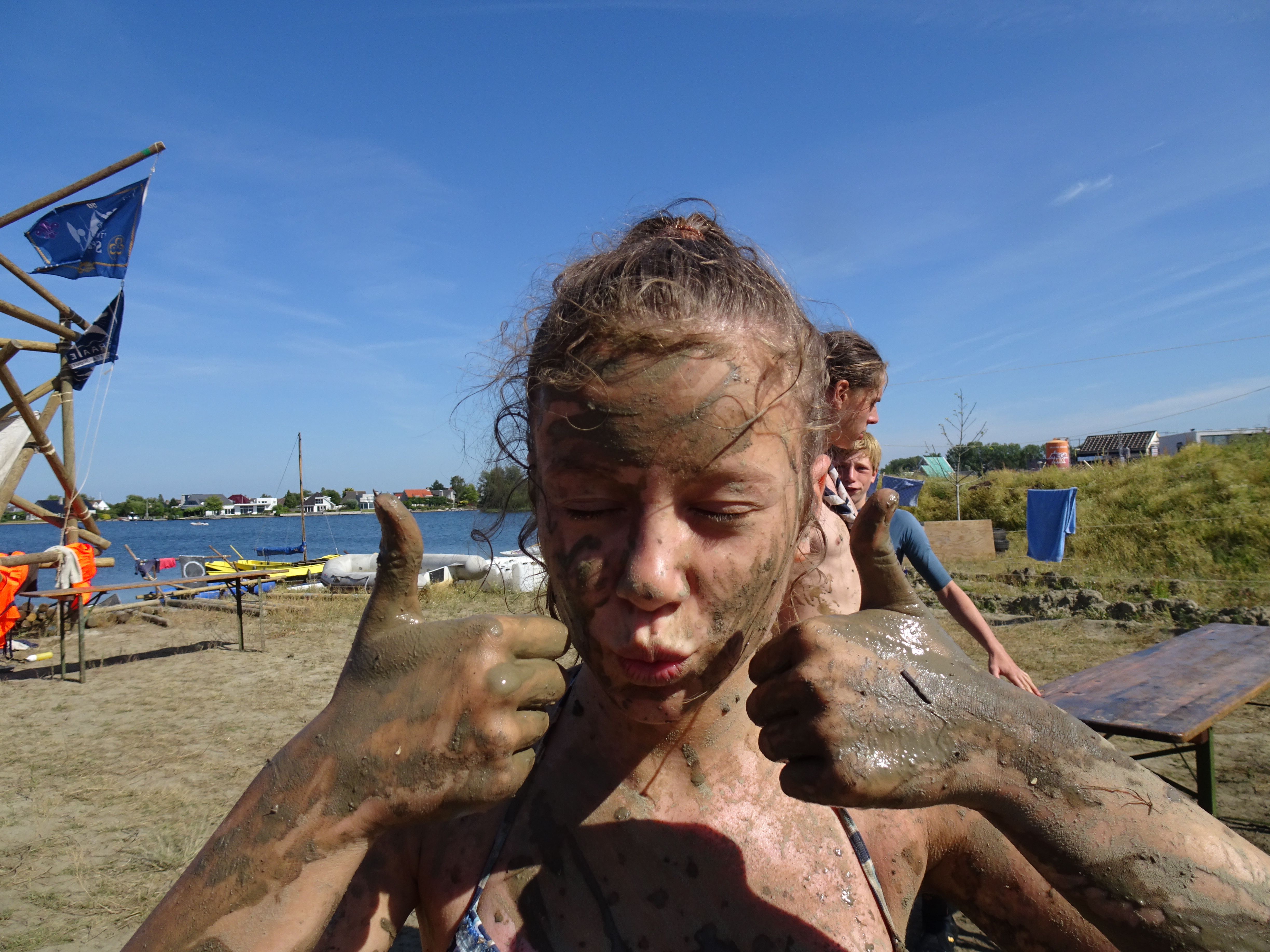 In de namiddag hebben we nog enkele opdrachten gedaan in verband met het spel: een parcours afleggen in de modder, eiwit opkloppen, spelletjes in het water, enz. Daarna mochten we ons afspoelen in het meer, want we waren allemaal héél vuil! Vanavond houden de welpen het rustig, want er is nog een nachtspel gepland.